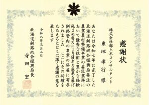 令和6年度に施工いたしました「農道特対 中幌呂1号線地区 用地測量1」の管理技術者が優秀技術者として釧路総合振興局長より感謝状を頂きました。